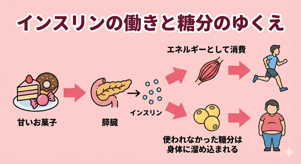 「血糖値が急上昇する→インスリンが大量に出る→消費されなかった糖分が脂肪に変わる」